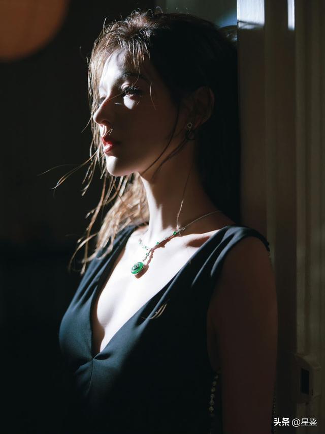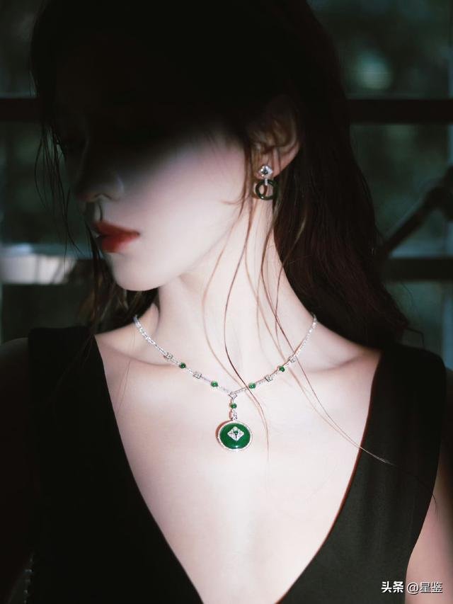 最点睛的当属那抹祖母绿配饰,冰种翡翠吊坠与耳饰温润通透,与冷调黑色礼服形成极致反差,冷艳中透着温婉东方韵味。湿发卷发造型随性又撩人,光影交错间,将现代礼服的摩登与东方珠宝的贵气融合得恰到好处。